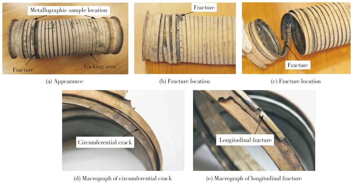 本研究所分析的金屬軟管為ASS 型結構,如圖1所示。在使用過程中發生了斷裂,其余部分位置則卡死不能伸縮。故障時行駛里程為3萬多km(標準要求是保證10萬km內不失效) ,其使用壽命遠遠低于預期。經市場返回的統計數據,同類型的金屬軟管發生較大比例斷裂,其斷裂的里程基本都集中在4萬km 以下。本研究對失效的金屬軟管進行宏觀分析、斷口分析、金相分析、能譜分析等,找到金屬軟管發生斷裂和卡死失效的原因,并提出改進建議。