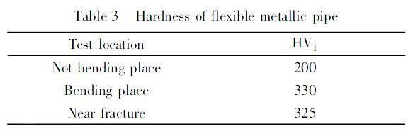 對金屬軟管的金相截面進行顯微硬度測試,結果如表3所示。在折彎處由于原材料加工硬化的影響,其硬度比非折彎處高。