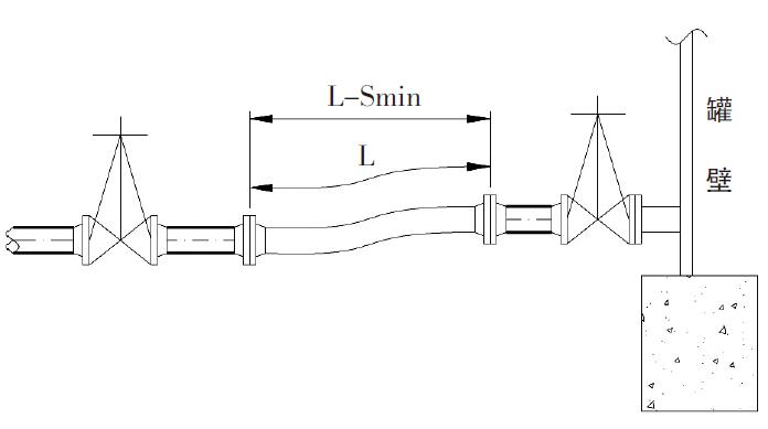 金屬軟管正確安裝是確保其性能充分發揮的重要環節。金屬軟管通常安裝在罐進出口管道根部閥之后,金屬軟管之后也有閥門,使儲罐與管道直接形成軟連接,便于金屬軟管的檢修和更換。金屬軟管在自然狀態下補償軸向位移能力有限,當安裝長度等于自然長度時,必然不能承受強大的軸向拉伸而產生斷裂, 從而導致管路泄漏。因此金屬軟管的安裝長度要小于自然長度,以保證一定的自由度。
